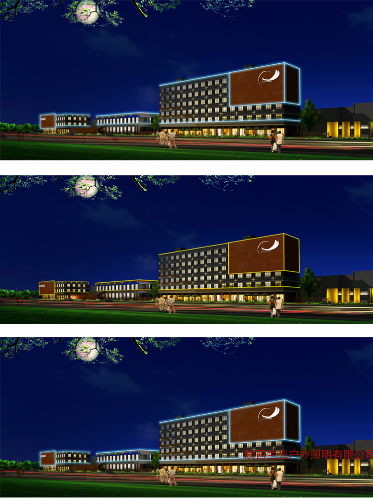 菜鳥亮化項目是我公司和阿里巴巴西安菜鳥公司溝通,做的初步設計效果圖,結合菜鳥配送中心的功能性,在主樓體做發光亮化效果,主要采用線條燈勾勒,點光源點綴效果,到達客戶需求的亮化效果。